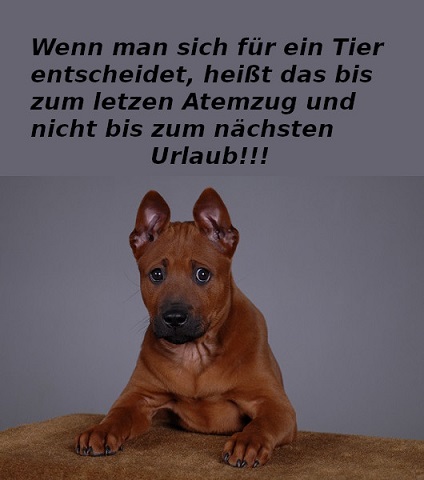Am Morgen bist Du sehr früh aufgestanden und hast die Koffer gepackt. Du nahmst meine Leine, was war ich glücklich! Noch ein kleiner Spaziergang vor dem Urlaub - hurra ! Wir fuhren mit dem Wagen, und Du hast am Straßenrand angehalten, die Tür ging auf, und Du hast einen Stock geworfen. Ich lief und lief, bis ich den Stock gefunden und zwischen meinen Zähnen hatte. Aber als ich zurückkam, warst Du nicht mehr da ! In Panik bin ich in alle Richtungen gelaufen, um Dich zu finden, aber vergebens. Ich wurde immer schwächer von Tag zu Tag. Ein fremder Mann kam, legt mir ein Halsband um und nahm mich mit. Bald befand ich mich in einem Käfig und wartete dort auf Deine Rückkehr. Aber Du bist nicht gekommen. Dann wurde der Käfig geöffnet. Nein Du warst es nicht - es war der Mann, der mich gefunden hat. Er brachte mich in einen Raum- es roch nach Tod. Meine Stunde war gekommen. Geliebtes Herrchen, ich will,daß Du weißt, daß ich mich trotz des Leidens, das Du mir angetan hast, noch stets an Dein Bild erinnere.